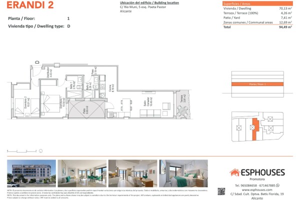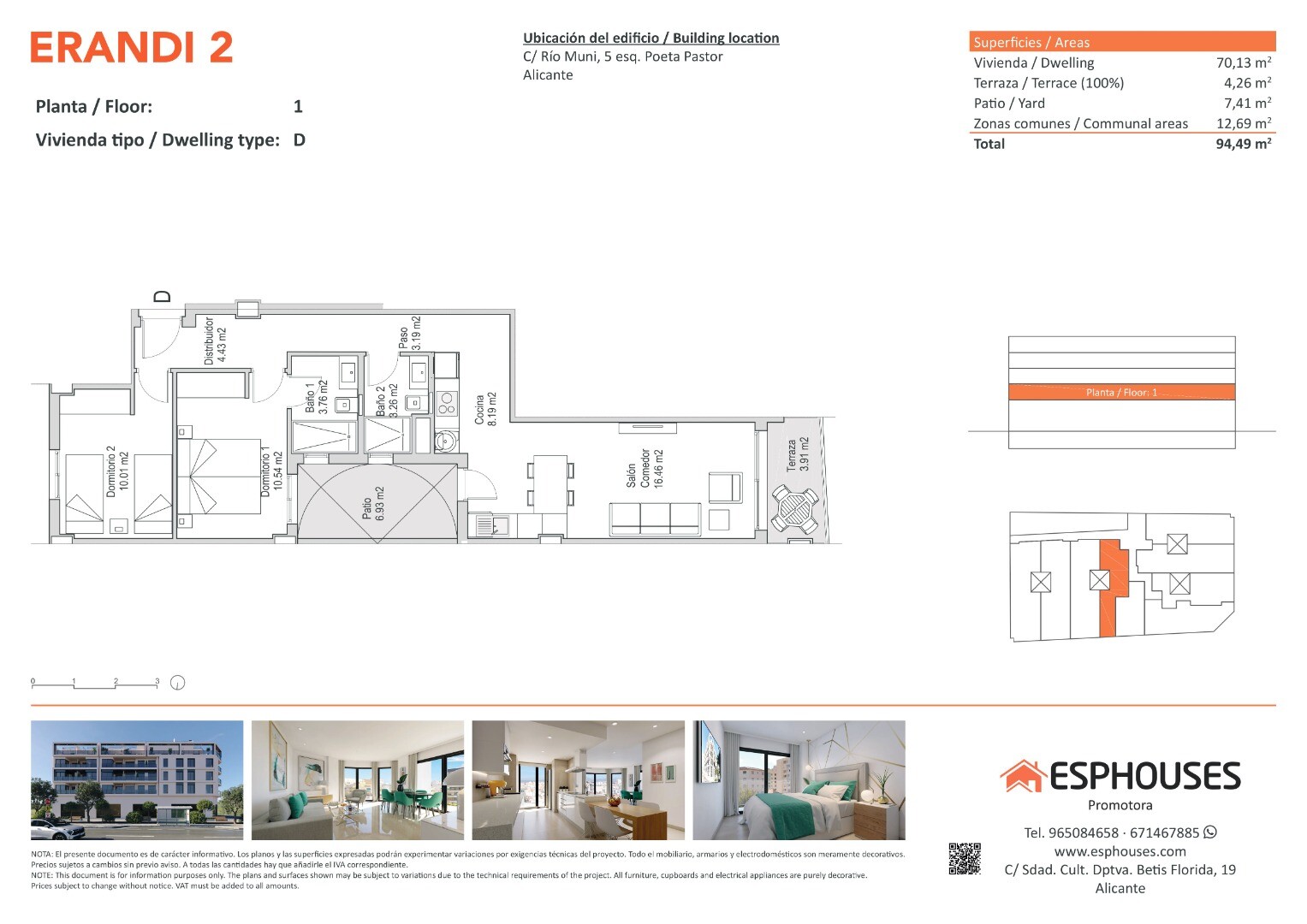 Šis jaunais dzīvoklis atrodas pirmajā stāvā ēkā ERANDI 2 un piedāvā kopējo platību 70,13 m². Mūsdienīgais un funkcionālais plānojums ietver 4,26 m² lielu terasi un 7,41 m² lielu iekšpagalmu — ideāli piemērots Vidusjūras klimata baudīšanai.