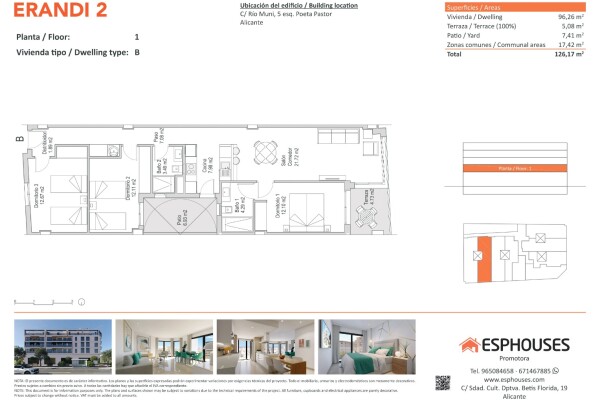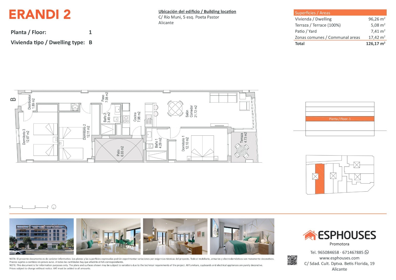 Šis jaunbūves dzīvoklis atrodas pirmajā stāvā ēkā ERANDI 2 un piedāvā kopējo platību 96,26 m². Tā mūsdienīgais plānojums ietver terasi 5,08 m² un pagalmu 7,41 m² — ideāli piemēroti, lai izbaudītu Vidusjūras klimatu.