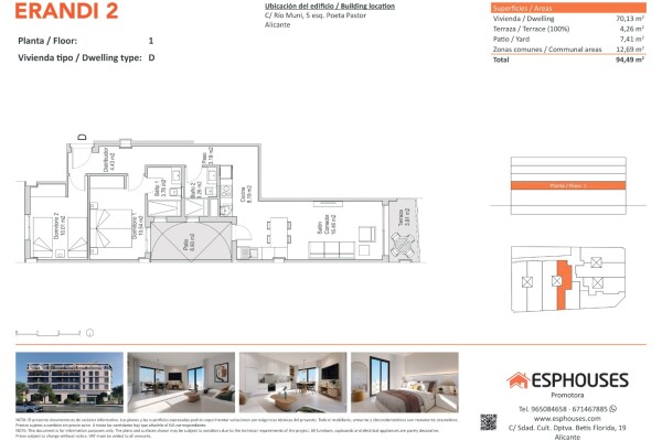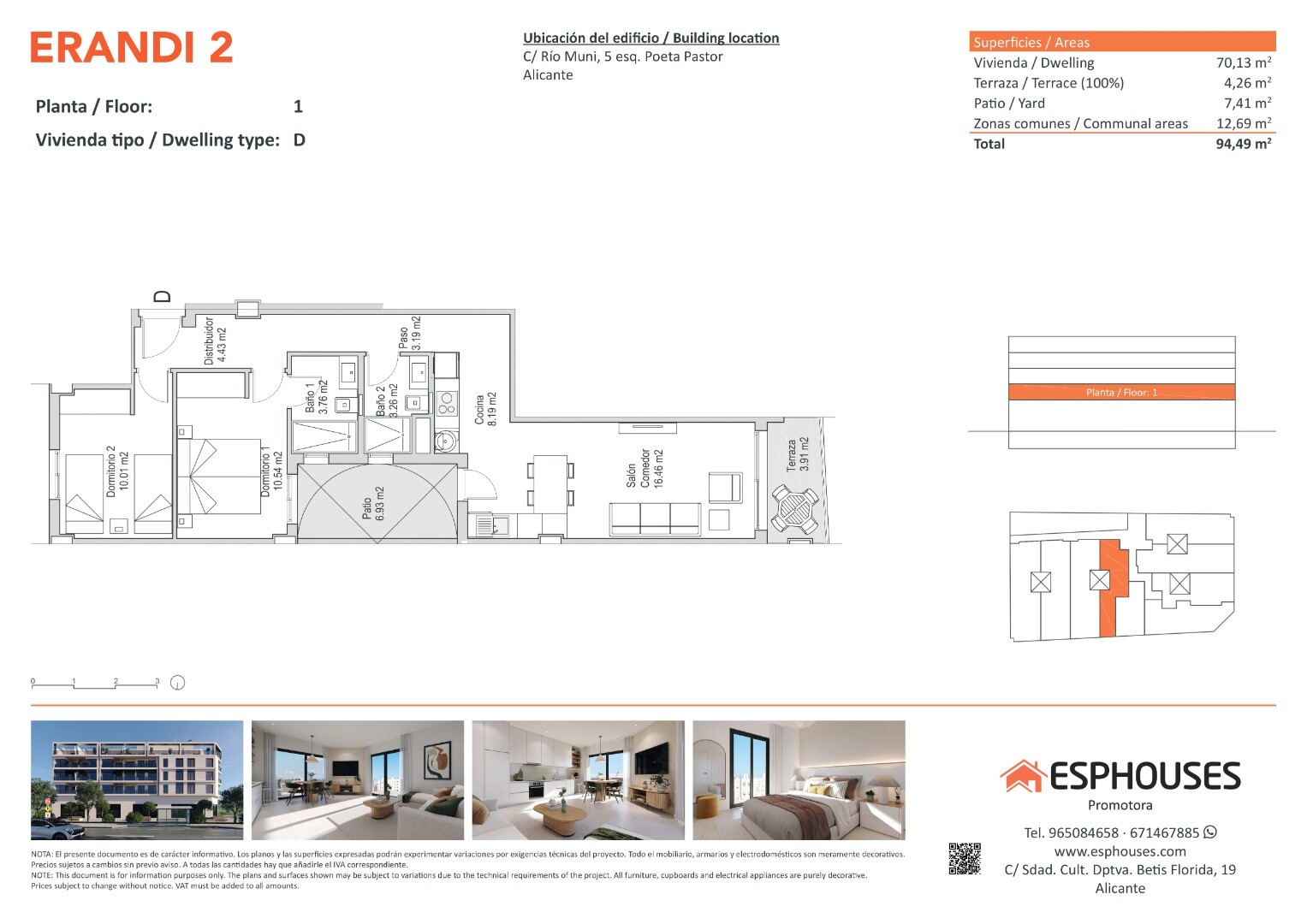 Šis jaunais dzīvoklis atrodas pirmajā stāvā ēkā ERANDI 2 un piedāvā kopējo platību 70,13 m². Mūsdienīgais un funkcionālais plānojums ietver 4,26 m² lielu terasi un 7,41 m² lielu iekšpagalmu — ideāli piemērots Vidusjūras klimata baudīšanai.