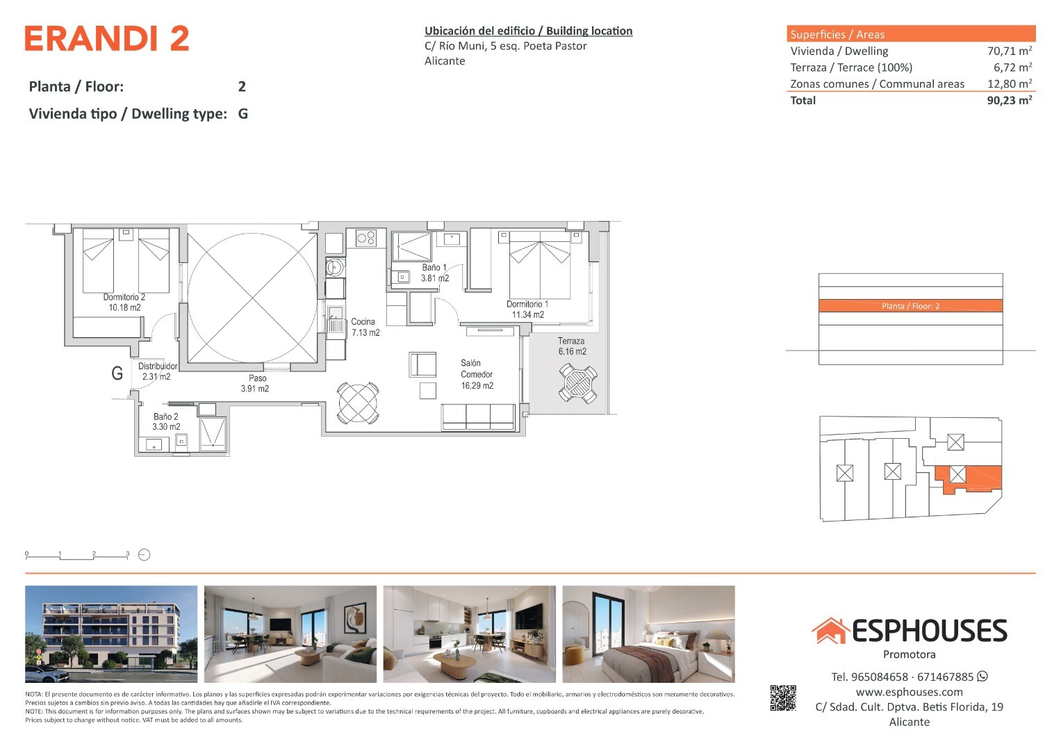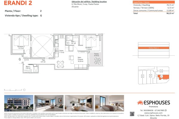 Šis moderns jaunbūves dzīvoklis atrodas ēkas ERANDI 2 otrajā stāvā — stilīgā projektā ar koplietošanas baseinu uz jumta, kas atrodas pazīstamajā La Floridas rajonā — vienā no vislabāk savienotajiem un strauji attīstošajiem Alikantes mikrorajoniem. Dzīvokļa kopējā platība ir 70,71 m², tajā ir divas guļamistabas ar iebūvētiem skapjiem, divas vannas i...stabas, viesistaba ar atvērta tipa virtuvi un 6,72 m² liela terase dienvidu virzienā — lieliski piemērota saules baudīšanai visas dienas garumā.