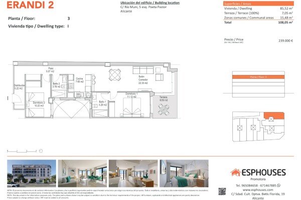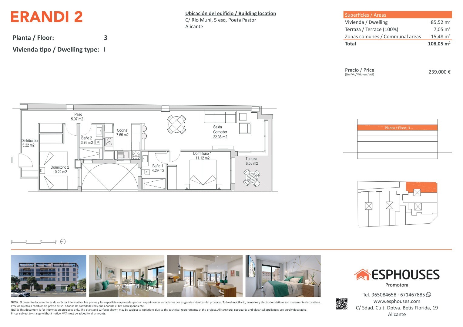 Šis gaišais jaunais dzīvoklis atrodas ERANDI 2 ēkas trešajā stāvā un piedāvā 85,52 m² kopējo platību. Pateicoties lieliskai orientācijai uz dienvidiem un funkcionālam plānojumam, tas ir ideāls risinājums prestižajā La Florida rajonā, kas ir labi savienots ar pārējo Alikanti.
