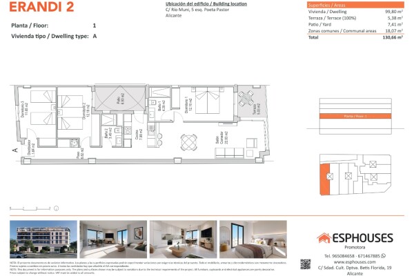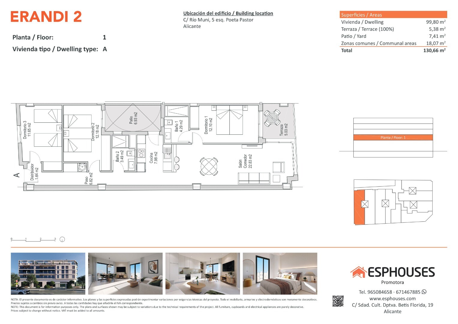 Šis jaunbūves dzīvoklis atrodas pirmajā stāvā ēkā ERANDI 2 un piedāvā plašu kopējo platību — 99,80 m². Tā plānojums ir ērts, un īpašumā ir divas ārtelpas: 5,38 m² terase un 7,41 m² iekšējais pagalms — ideāli, lai izbaudītu Alikantes saulaino klimatu.