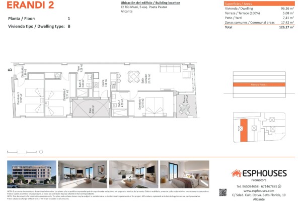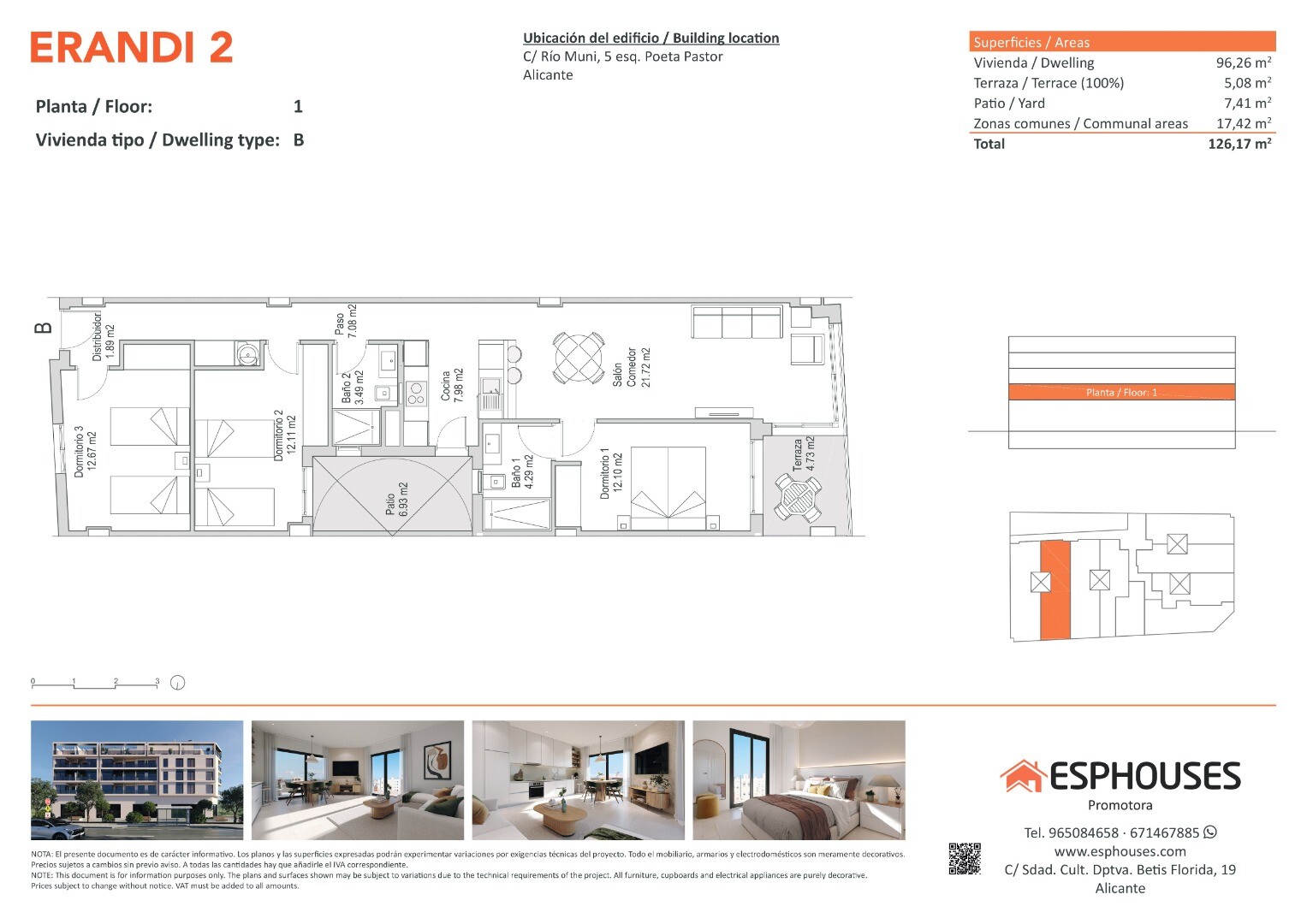 Šis jaunbūves dzīvoklis atrodas pirmajā stāvā ēkā ERANDI 2 un piedāvā kopējo platību 96,26 m². Tā mūsdienīgais plānojums ietver terasi 5,08 m² un pagalmu 7,41 m² — ideāli piemēroti, lai izbaudītu Vidusjūras klimatu.
