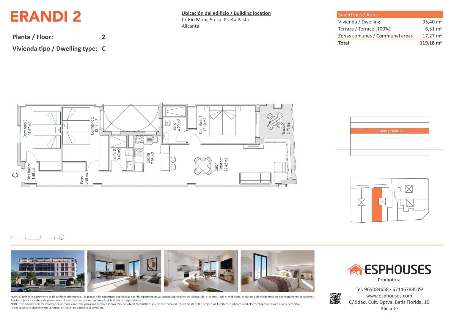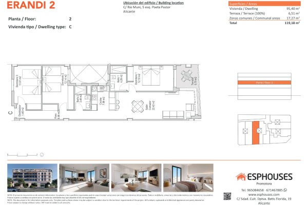 Šis mūsdienīgais jaunbūves dzīvoklis atrodas ēkas ERANDI 2 otrajā stāvā — modernā dzīvojamā ēkā ar koplietošanas baseinu uz jumta, izvietotā zināmajā La Floridas rajonā, vienā no vislabāk attīstītajiem un savienotajiem rajoniem Alikantē. Kopējā platība ir 95,40 m², dzīvoklī ir trīs guļamistabas ar iebūvētiem skapjiem, divas vannas istabas, plaša vi...esistaba ar atvērta tipa virtuvi un 6,51 m² liela terase ar rietumu orientāciju — ideāli piemērota atpūtai saulainos pēcpusdienos.