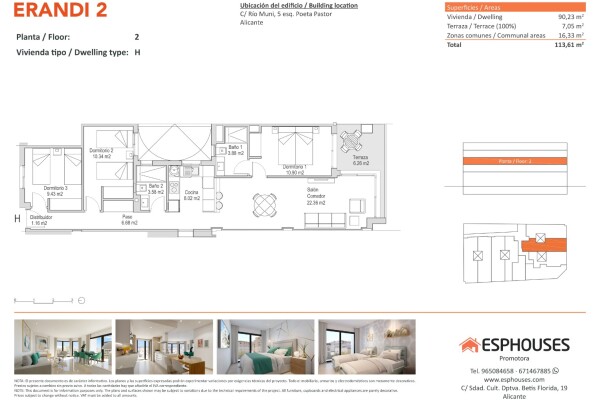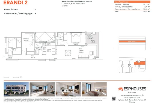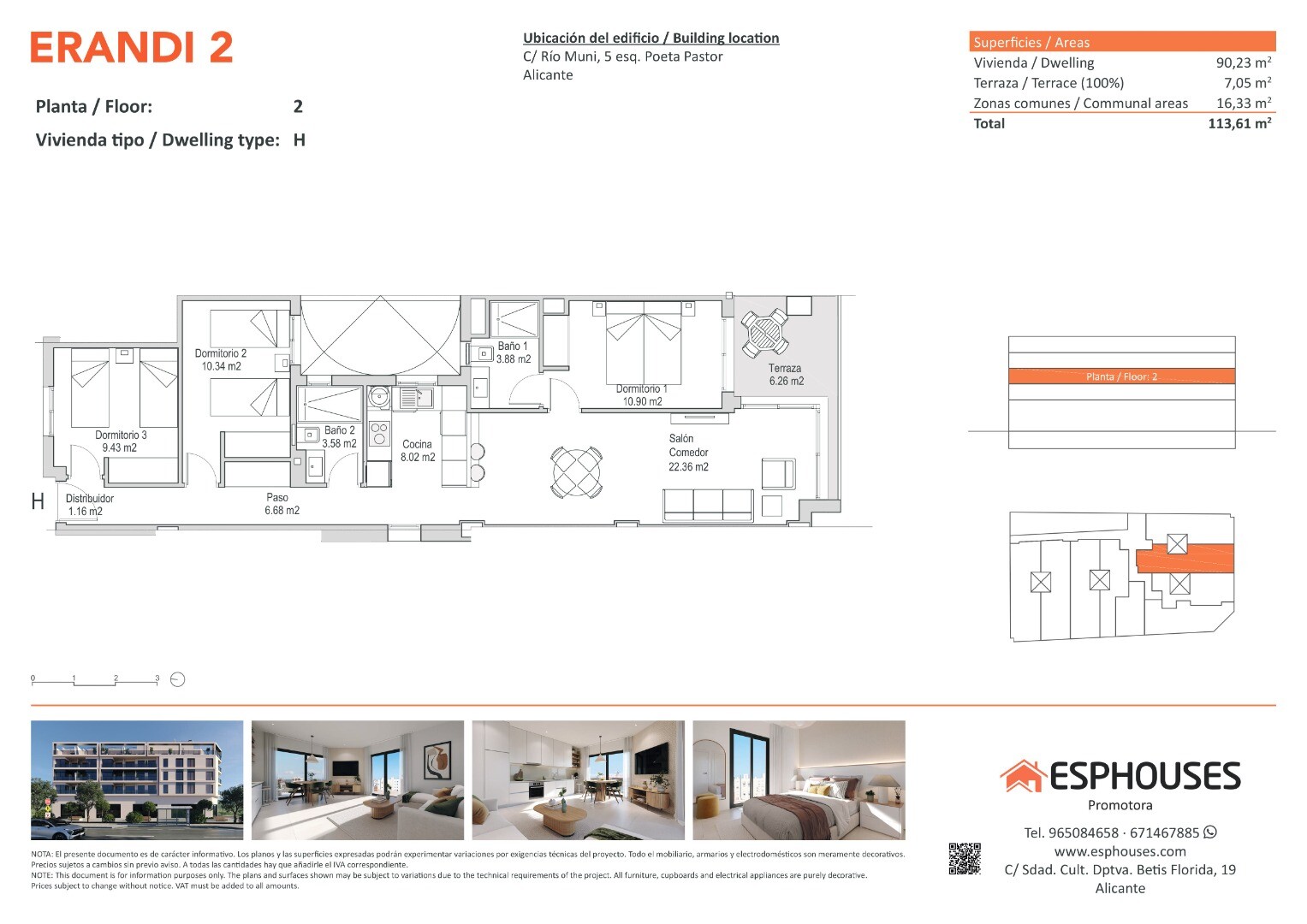 Šis gaišais dzīvoklis atrodas ēkas ERANDI 2 otrajā stāvā, populārajā La Floridas rajonā – vienā no vislabāk savienotajiem un attīstītākajiem Alikantes rajoniem. Dzīvokļa kopējā platība ir 90,23 m², tas piedāvā trīs guļamistabas ar iebūvētiem skapjiem, divas vannas istabas, viesistabu ar atvērta tipa virtuvi un 7,05 m² plašu terasi ar dienvidu orien...tāciju — ideāli piemērotu saules baudīšanai visas dienas garumā.