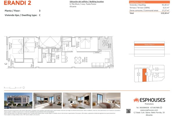 Šis šviesais trešā stāvā esošais dzīvoklis Edificio ERANDI 2 apvieno plašu interjeru, mūsdienu dizainu un izcilu atrašanās vietu labi savienotajā La Floridas rajonā Alikantē. Kopējā platība – 95,40 m². Dzīvoklī ir trīs guļamistabas ar iebūvētiem skapjiem, divas vannas istabas, plaša viesistaba ar virtuvi un 6,51 m² liela terase ar rietumu orientāci...ju — ideāls vieta pēcpusdienas saulei.