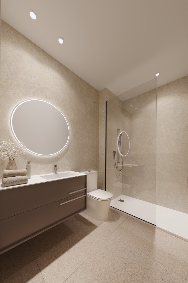 Dzīvoklī ir trīs guļamistabas ar iebūvētiem skapjiem, divas pilnas v...annas istabas, gaiša viesistaba ar atvērtu virtuvi un 7,05 m² liela privāta terase – ideāli piemērota Vidusjūras klimatam.