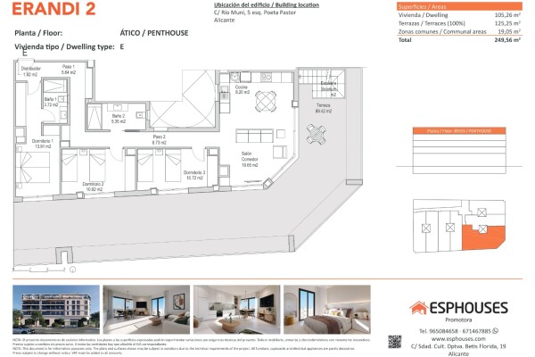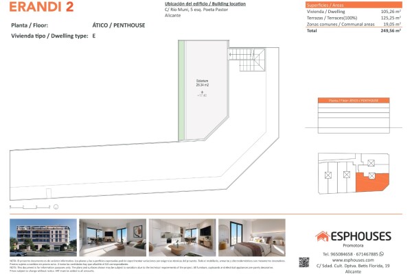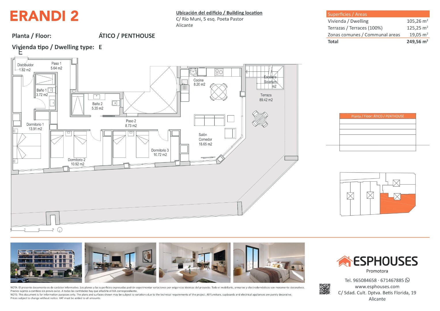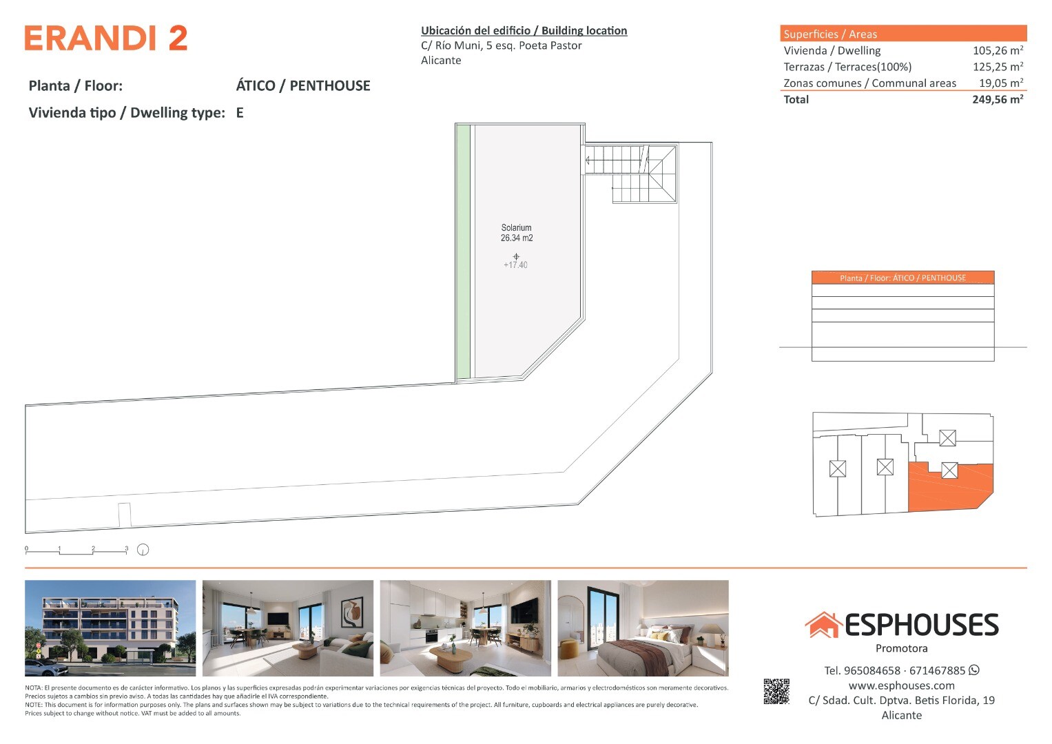 Šis iespaidīgais jaunbūves penthauss atrodas ceturtajā ERANDI 2 ēkas stāvā, simboliskajā La Florida rajonā – vienā no visattīstītākajiem un labāk savienotajiem Alikantes apvidiem. Ar 105,26 m² lielu kopējo platību dzīvoklī ir trīs plašas guļamistabas ar iebūvētajiem skapjiem, divas pilnībā aprīkotas vannas istabas un gaiša dzīvojamā istaba ar atvēr...tā tipa virtuvi modernā un funkcionālā plānojumā, kas maksimāli izmanto dabīgo apgaismojumu.