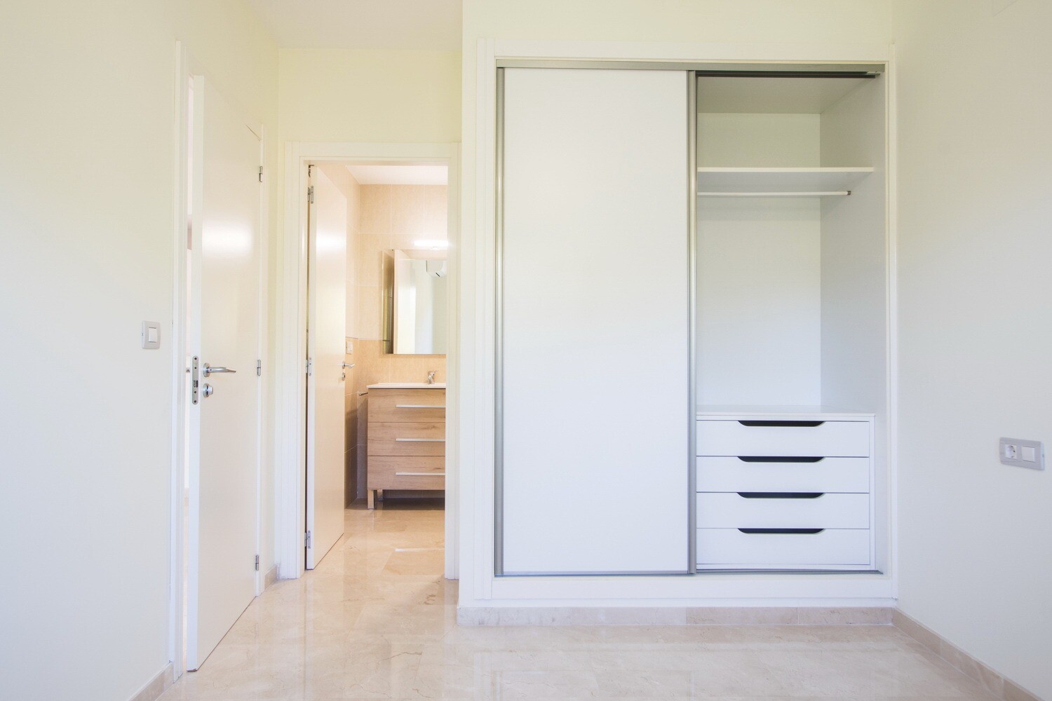 Guļamistabas ir dāsnas ar plašu skapi, nodrošinot komfortu un stilu.