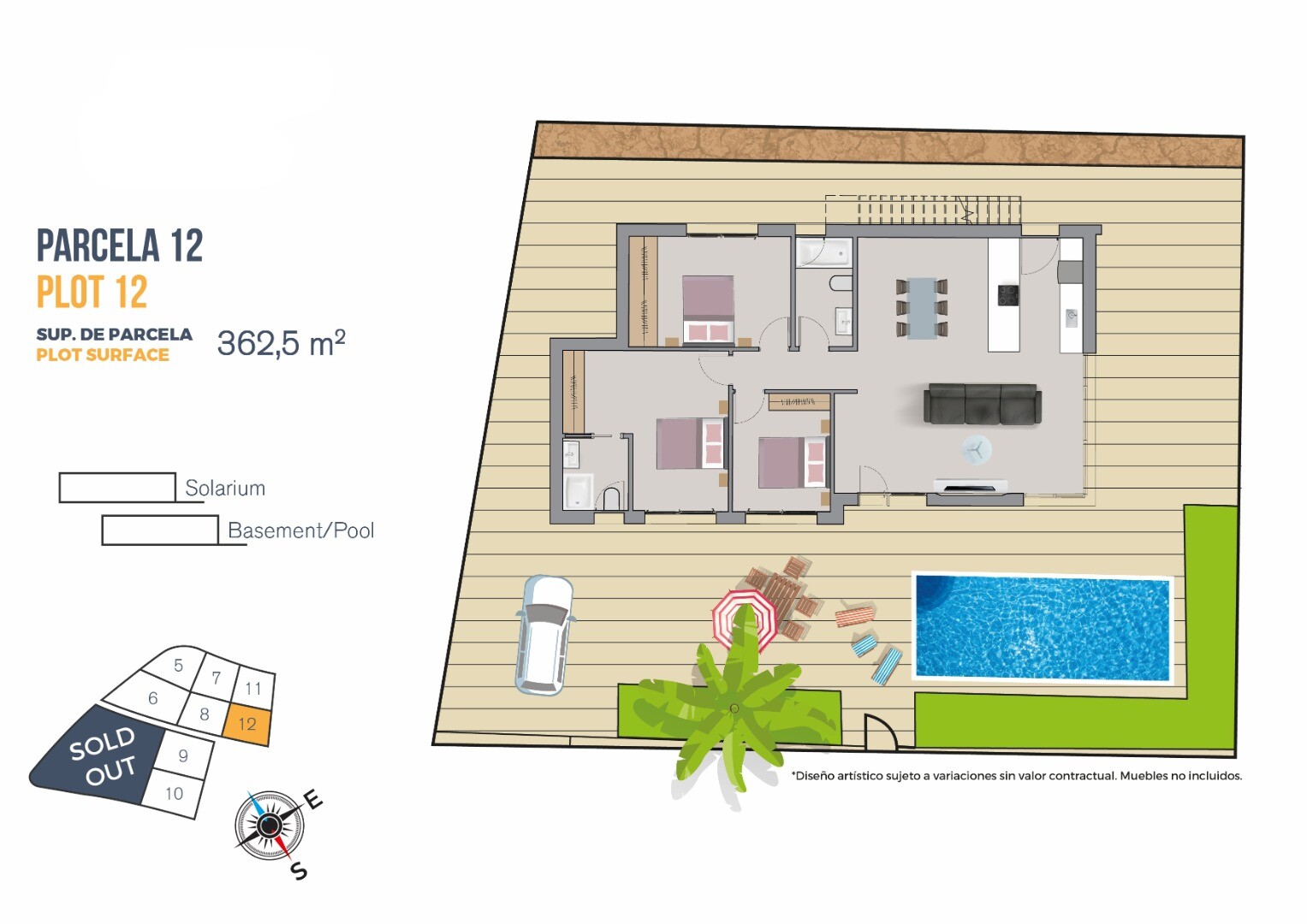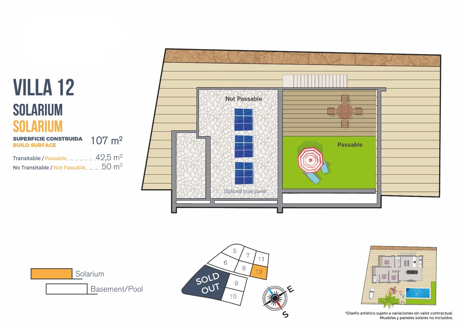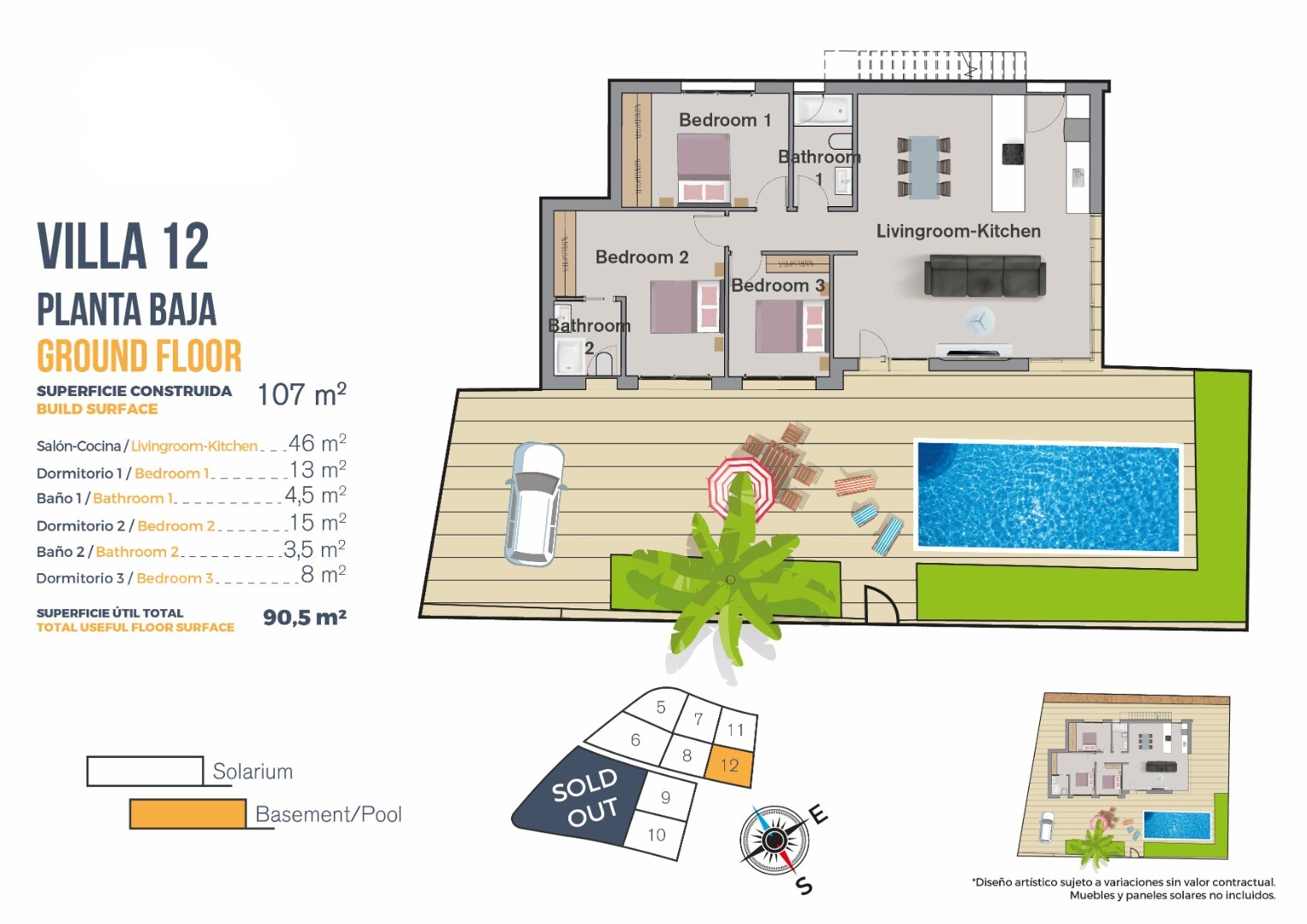 Šajā uz dienvidaustrumiem vērstajā vienstāva villā ir 3 guļamistabas un 2 vannas istabas. Tajā ir 46 m² liela dzīvojamā/ēdamistaba ar skatu uz baseinu. Īpašumā ir pieejama autostāvvieta, kā arī 6x3 m peldbaseins un iespēja uzbūvēt grilu/āra virtuvi. Tajā ir iepriekš uzstādīta gaisa kondicionēšana, kas ierīkota gaisa vadu sistēmā. Mūsu tīmekļa vietn...ē redzamās fotogrāfijas ir no paraugmājas, kur varat novērtēt apdares kvalitāti.