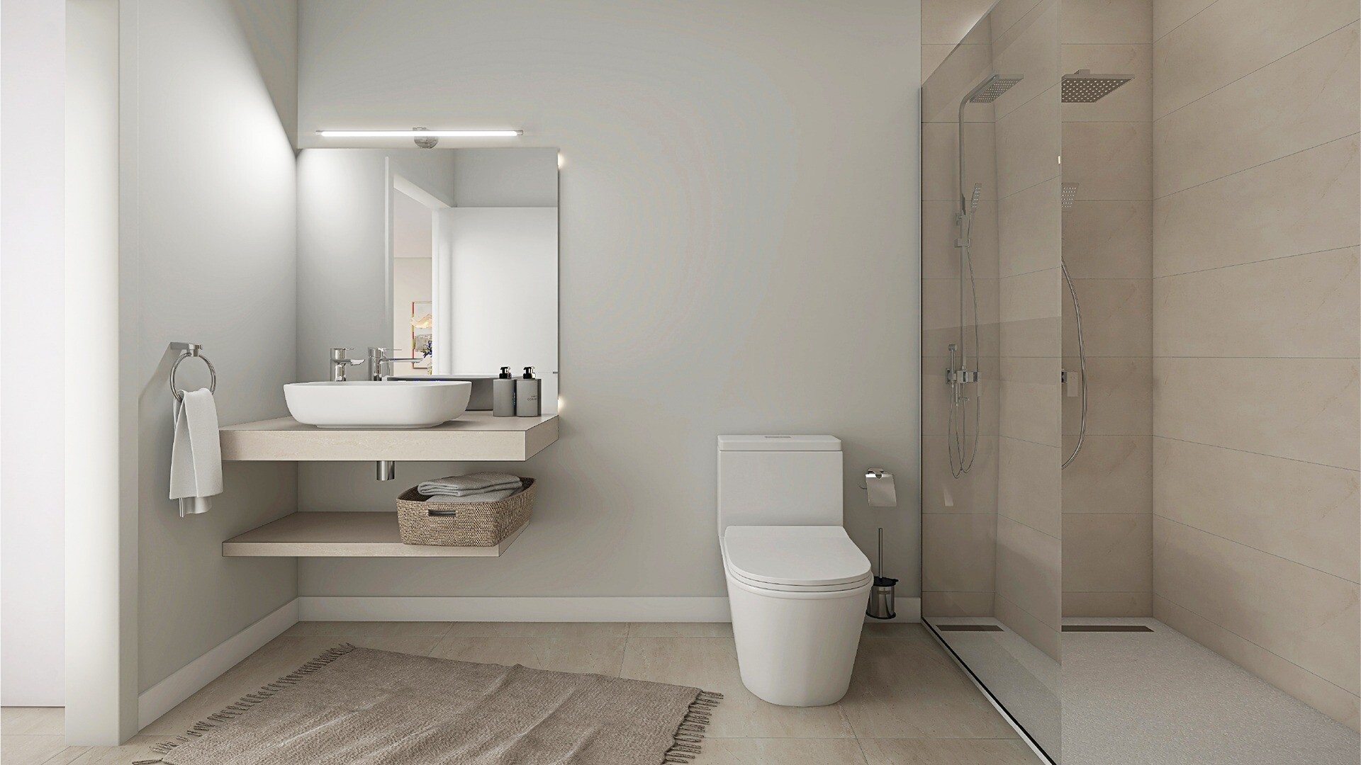 Dzīvoklī ir 3 guļamistabas ar iebūvētiem skapjiem un 2 vannas istabas. Plašā viesistaba ar ēdamzonu un atvērtu virtuvi ar sadzīves tehniku rada modernu un gaišu dzīvojamo telpu.