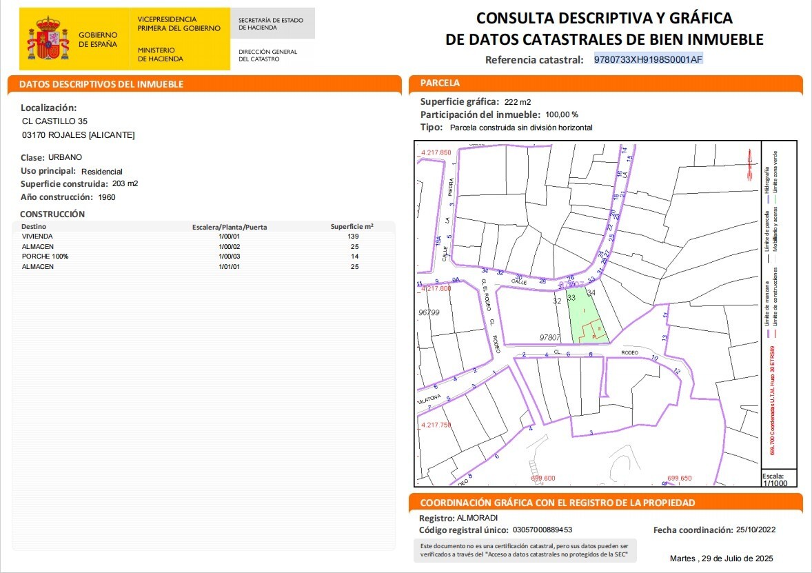 Iespēja Rojales vecpilsētas sirdī. Pārdod 222 m² lielu pilsētas zemes gabalu (saskaņā ar zemesgrāmatu), ar fasādi uz divām ielām, ideāli piemērots, lai uzceltu savu sapņu māju vai investētu projektā ar lielu potenciālu. Zemes gabalā pašlaik atrodas nepabeigta celtne, tāpēc jūs varat turpināt esošos darbus vai nojaukt celtni un sākt no jauna, atbils...toši savai vīzijai un vajadzībām. Zemes gabals atrodas burvīgā, klusā rajonā, tikai dažu minūšu gājiena attālumā no visiem pakalpojumiem: lielveikaliem, restorāniem, aptiekām, bankām, sabiedriskā transporta pieturām, skolām un citām iestādēm. Tikai 10 minūšu attālumā no Guardamar pludmalēm un 35 minūšu attālumā no Alikantes lidostas. Sazinieties ar mums, lai vienotos par apmeklējumu un atklātu visu šī nekustamā īpašuma potenciālu!