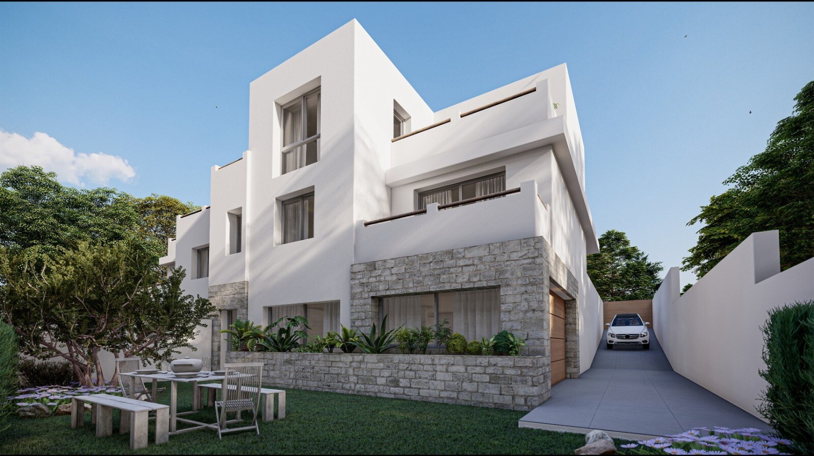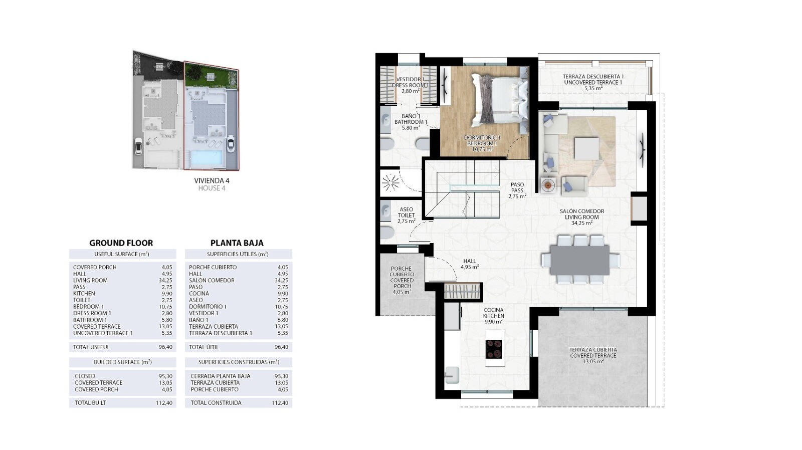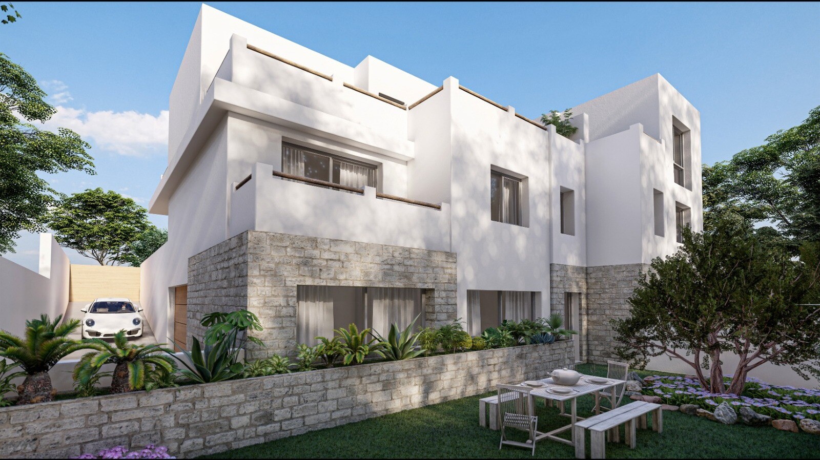 Šai trīs līmeņu villai pirmajā stāvā ir plaša un gaiša dzīvojamā–ēdamzona ar atvērta tipa virtuvi, kas ir ideāli piemērota viesu uzņemšanai. Galvenā guļamistaba ar garderobi un privātu vannas istabu (en suite) ir ērti izvietota šajā līmenī, nodrošinot dzīvi vienā stāvā. Augšējā stāvā atradīsiet vēl divas guļamistabas un pilnībā aprīkotu vannas istabu. Daudzfunkcionālais pagrabs var kalpot kā garāža, papildu dzīvojamā telpa vai spēļu istaba.