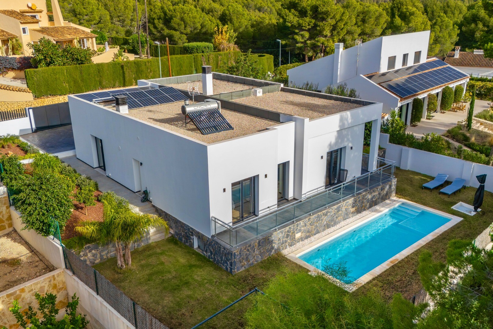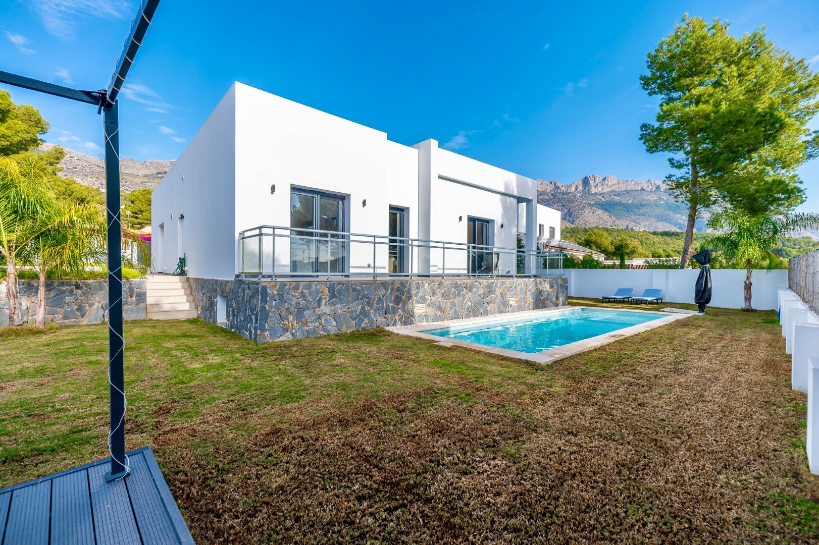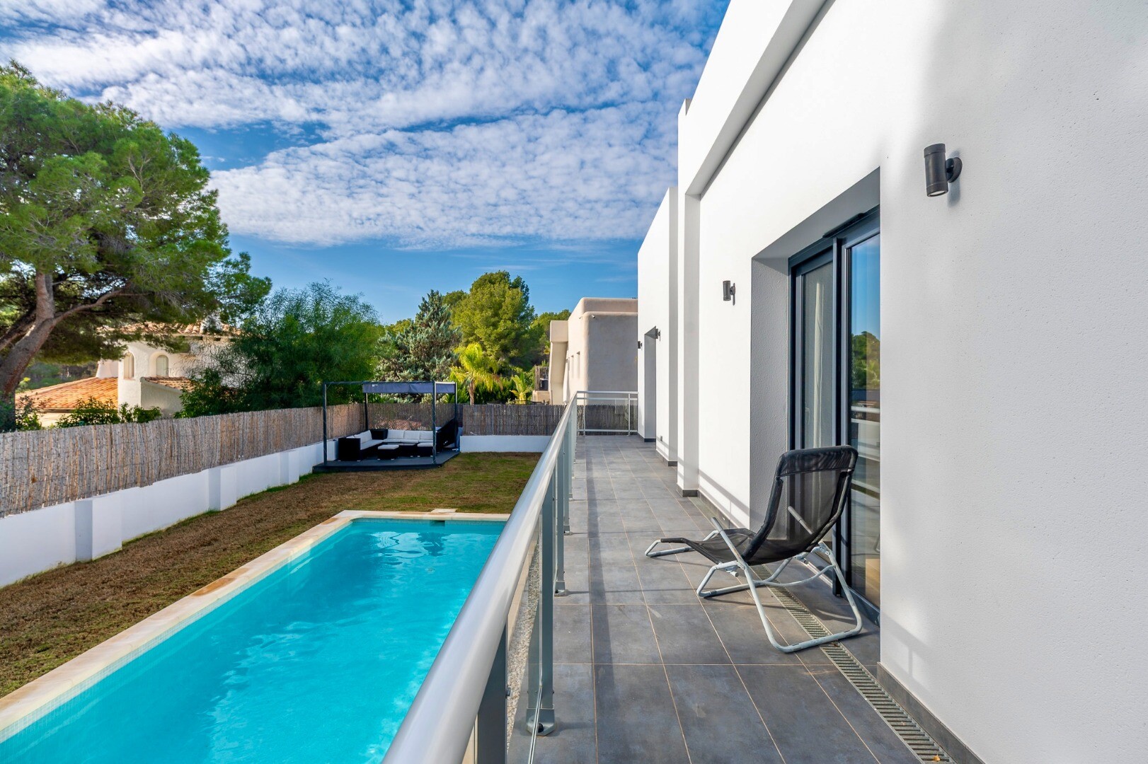 Īpašums, kas uzbūvēts 2021. gadā, izceļas ar tīrām arhitektūras līnijām un izsmalcinātu estētiku, piedāvājot gaišas un harmoniskas telpas, kuras viegli pielāgot individuālām vēlmēm.... Villa ir izbūvēta vienā līmenī uz plaša, uz dienvidiem vērsta zemesgabala, un tajā ir četras guļamistabas un trīs vannas istabas – ideāli gan pastāvīgai dzīvošanai, gan atpūtai.