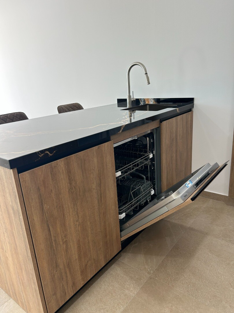 Liela atvērta plānojuma dzīvojamā platība 45 m², kas apvieno dzīvojamo istabu, ēdamistabas zonu un pilnībā aprīkotu dizaineru virtuvi ar salu