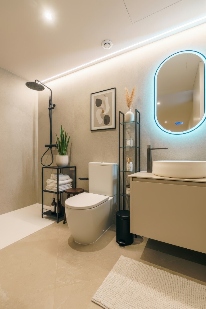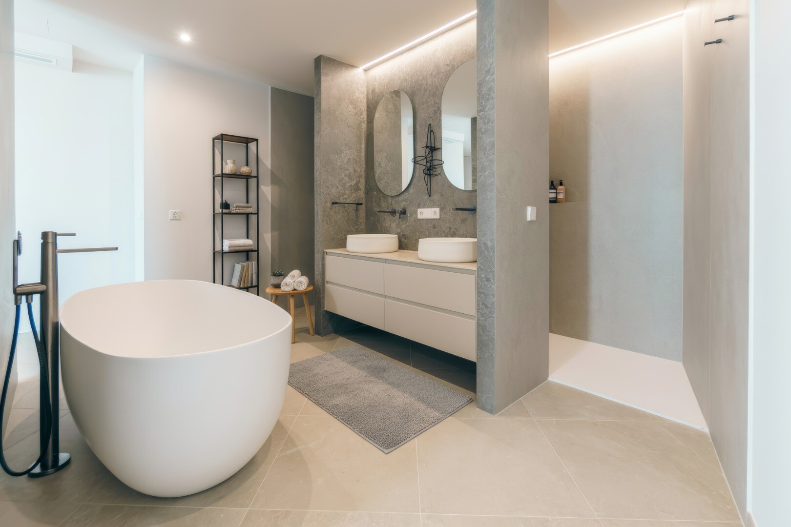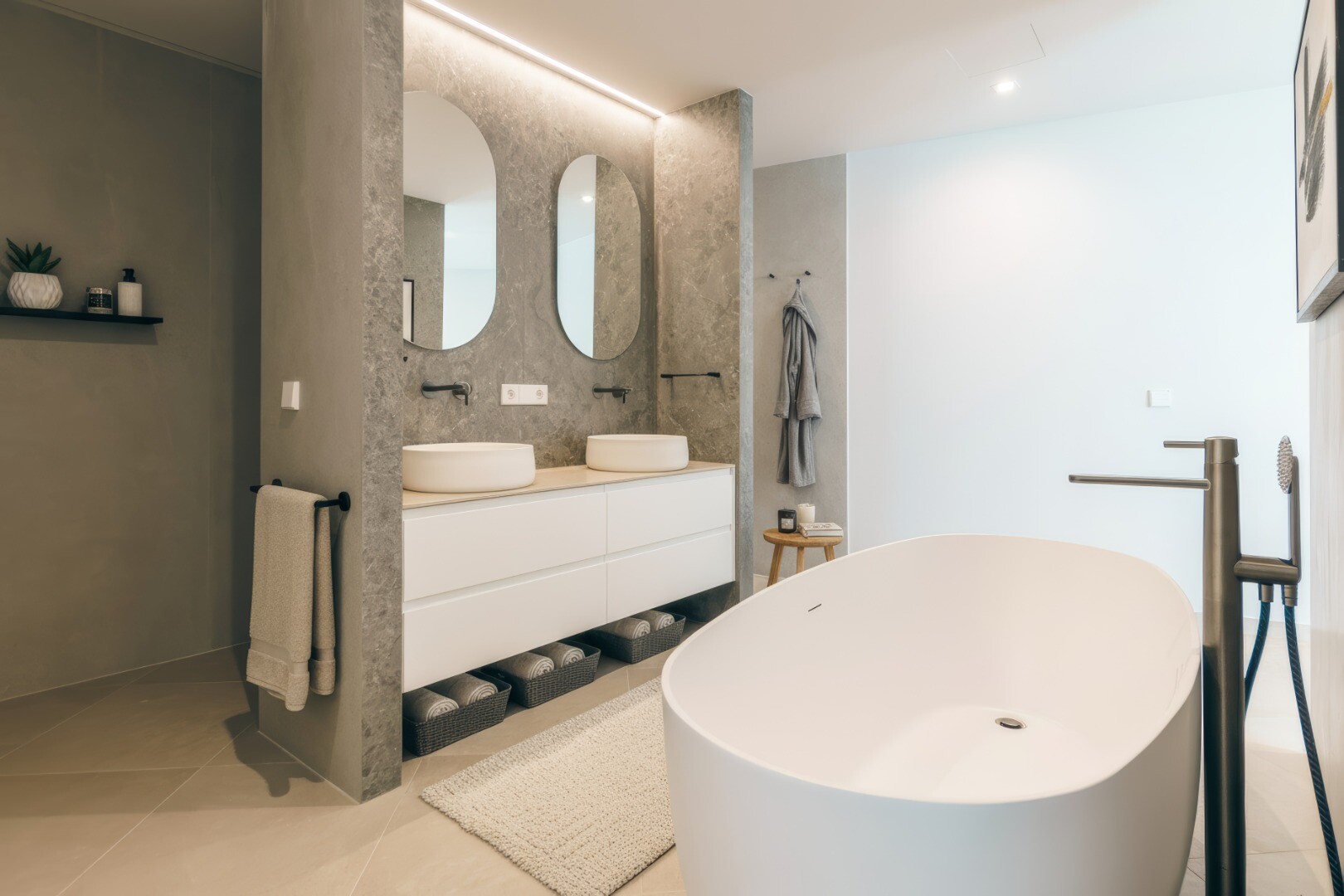 La villa ofrece cinco espaciosas habitaciones con baño privado y seis baños, con elegantes acabados en tonos piedra, iluminación ambiental y duchas a ras de suelo. La suite principal es un auténtico refugio privado, con bañera exenta y lavabo doble, que evoca la comodidad de un hotel de lujo.