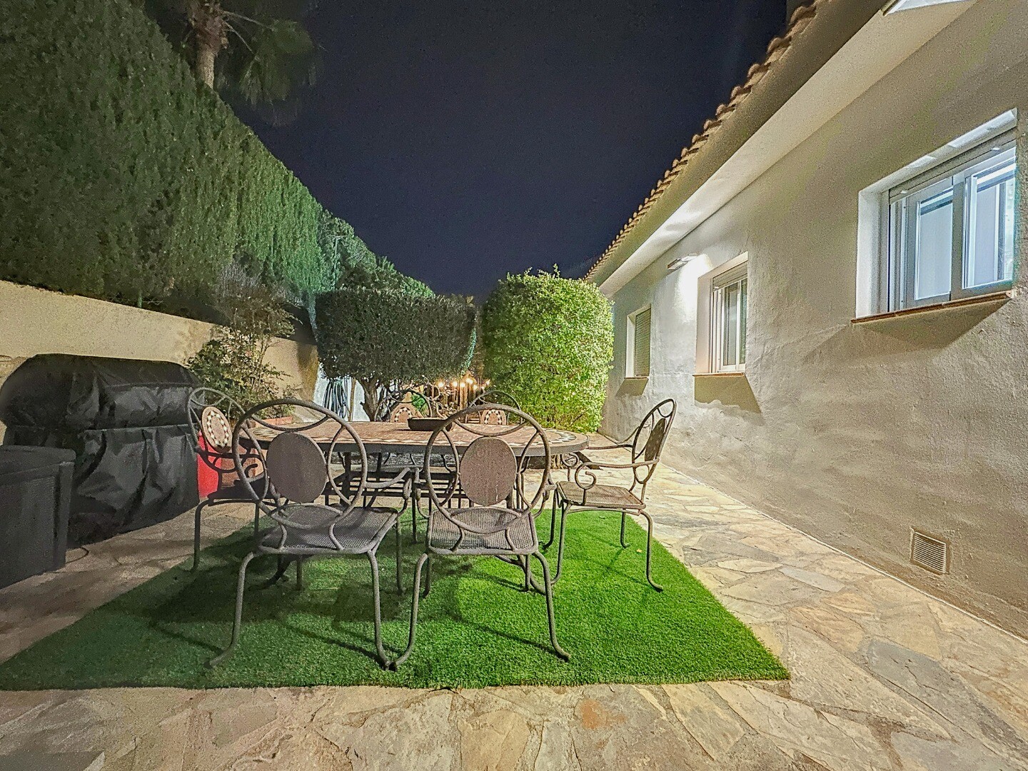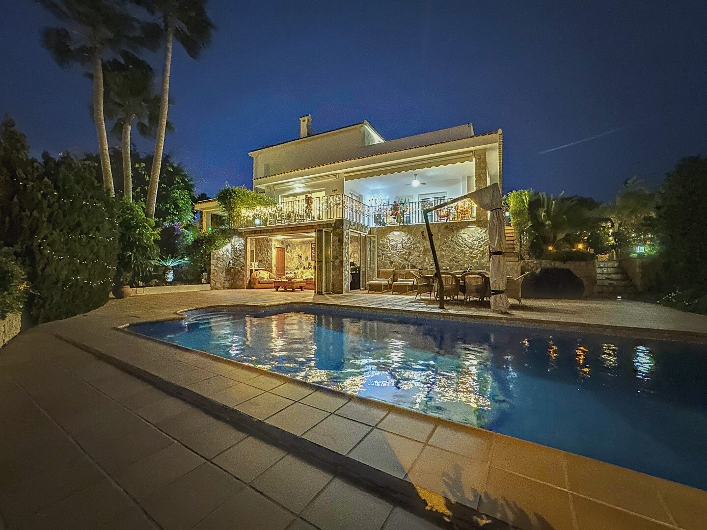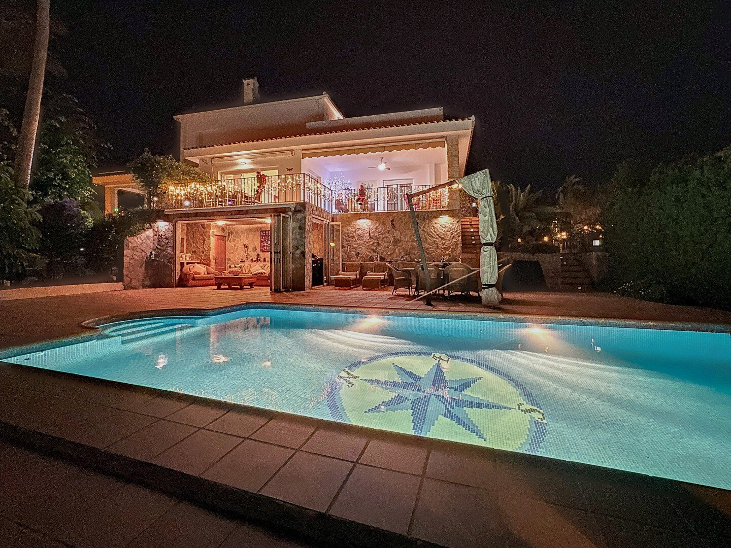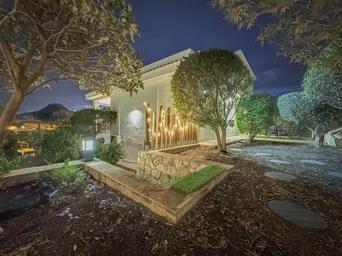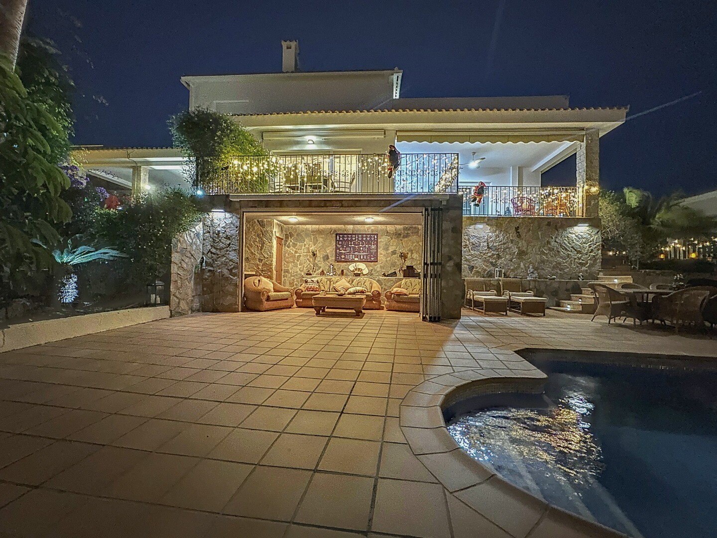 Ieejot šajā ievērojamajā īpašumā, jūs sagaidīs s...ulīgi dārzi, kas rotāti ar LED apgaismojumu, kas visu vakaru rada maigu mirdzumu, radot burvīgu atmosfēru, kas ir ideāli piemērota atpūtai vai izklaidei. Skaisti veidotajā āra telpā ir satriecošs privāts sālsūdens baseins, kas aicina jūs iegremdēties atsvaidzinošā peldē, ko ieskauj mierīga ainava.