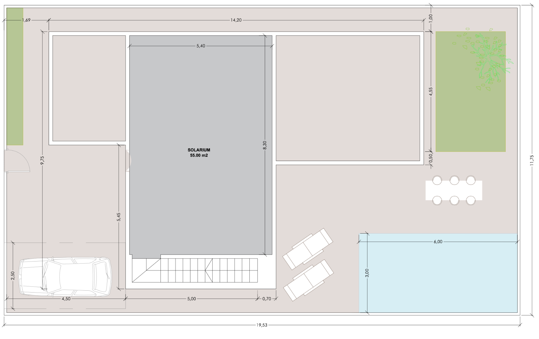 55 m² solārijs. 5,40 m x 3 m peldbaseins.
